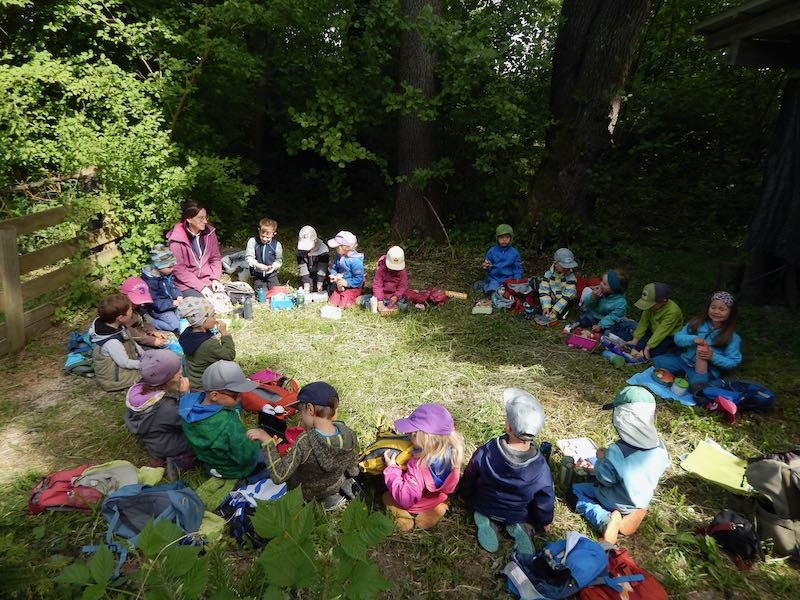 Für die Vormittagsbrotzeit bringt jedes Kind seinen eigenen Rucksack mit Brotzeit und Trinken mit. Im Winter empfehlen wir Thermoskannen mit warmem Tee.